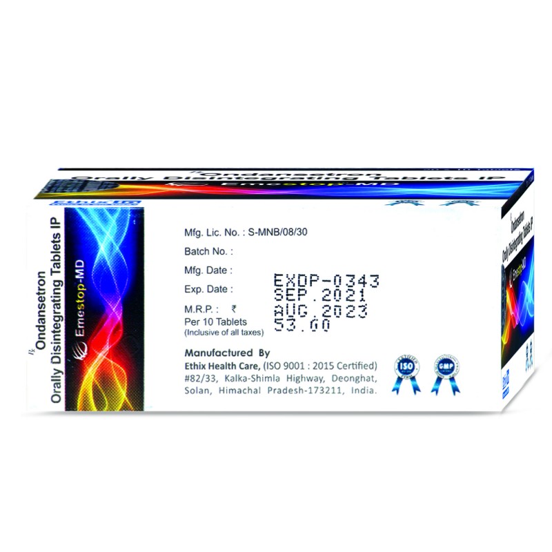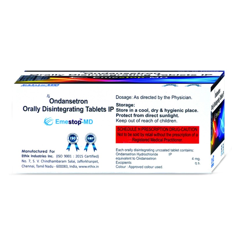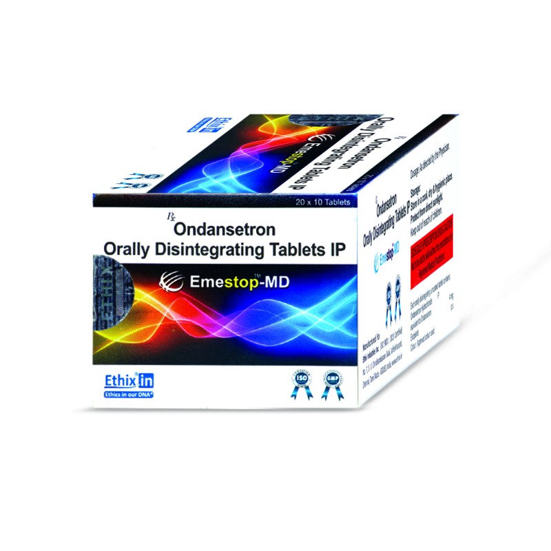 EmeStop MD is a mouth-dissolving tablet containing 4 mg of Ondansetron, an effective antiemetic medication widely used to prevent nausea and vomiting caused by chemotherapy, radiation therapy, and post-surgical recovery. Its mouth-dissolving form allows for quick absorption and fast relief, especially useful for patients who have difficulty swallowing tablets or need immediate anti-nausea support. Ondansetron works by blocking the action of serotonin, a natural substance in the body that triggers nausea and vomiting.