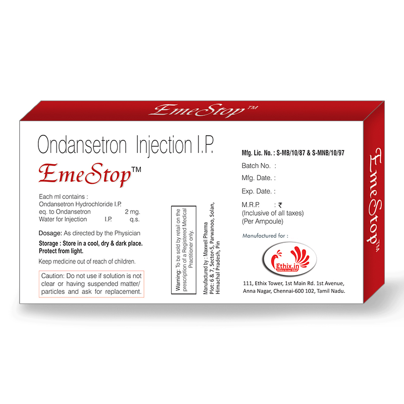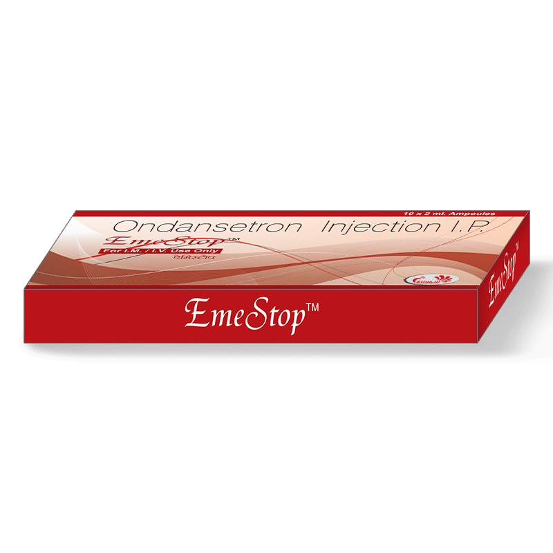 Ondansetron in EmeStop inj is a 5-HT3 receptor antagonist, prescribed for nausea and vomiting caused by cancer chemotherapy, radiation therapy and surgery. It blocks serotonin receptors in the vomiting center and on nerves supplying the digestive system. Ondansetron helps with upset stomach and throwing up.