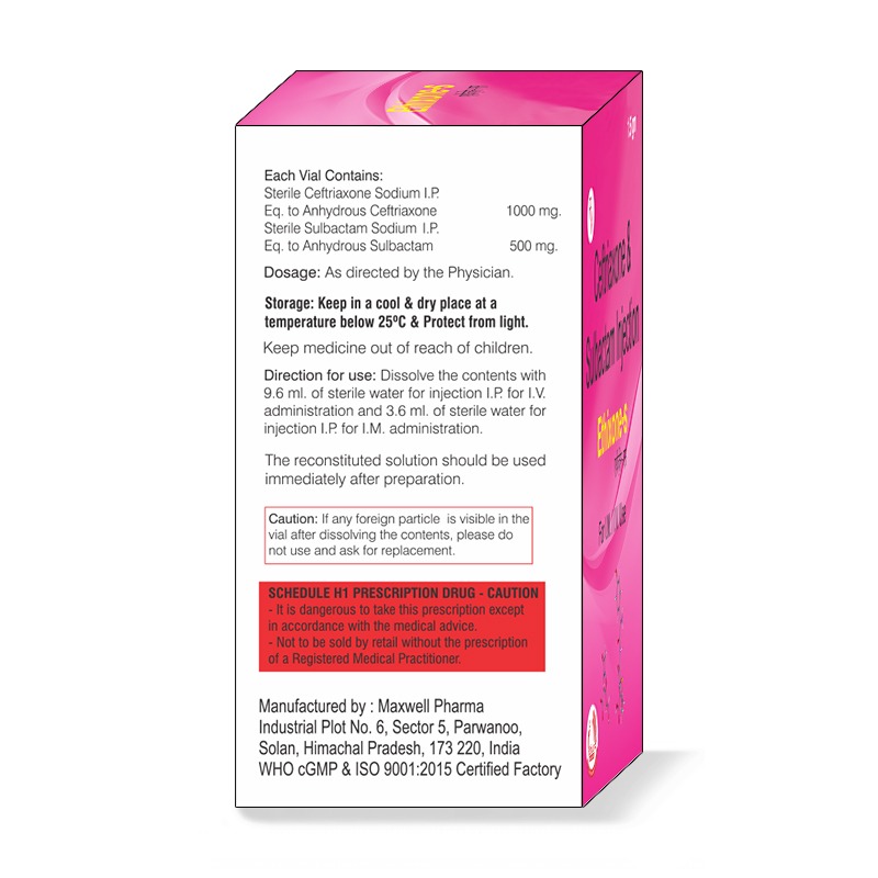 - Composition: Ceftriaxone 1000mg + Sulbactam 500mg (W.F.I)