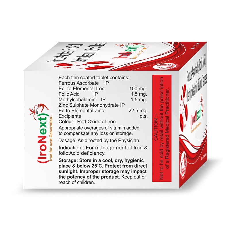 IroNext Tablet is a comprehensive iron supplement designed to effectively combat iron deficiency anemia and support overall health. Enriched with Ferrous Ascorbate, Folic Acid, and Zinc, this formulation ensures optimal absorption and utilization of essential nutrients required for red blood cell production, oxygen transport, and immune system health.