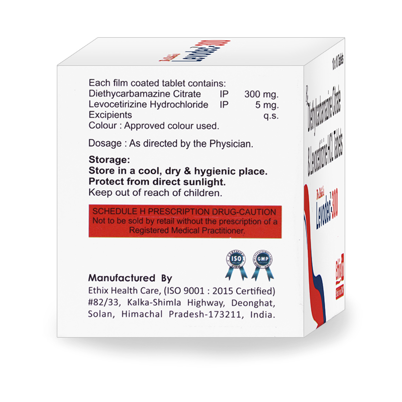 - Composition: DiEthylCarbamazine Citrate-300 mg + Levocetirizine-5 mg