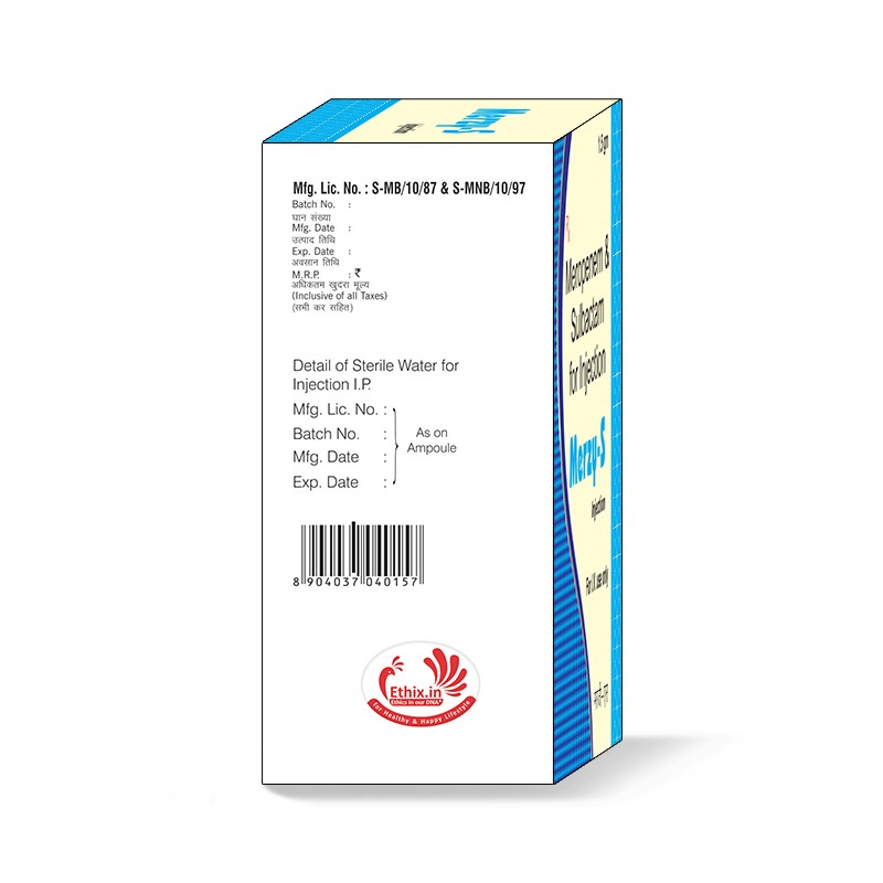 - Composition: Meropenam-1 mg + Sulbactum-500mg (W.F.I.)