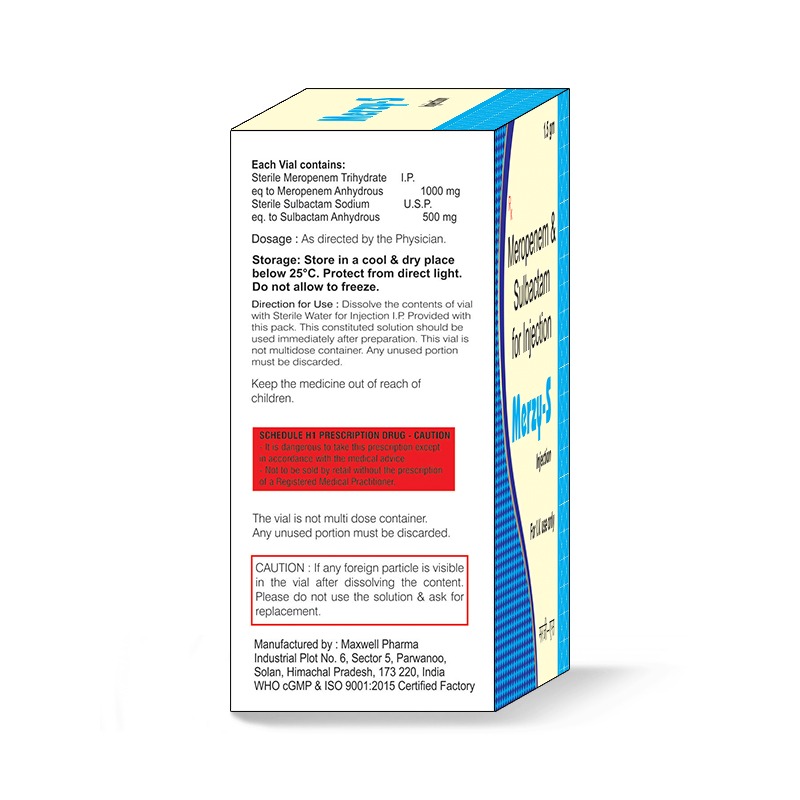Dosage and Administration: Merzy-S 1500mg is administered by intravenous infusion. The dosage and duration of treatment depend on the type and severity of the infection, as well as patient-specific factors such as age, weight, and renal function. Always follow the healthcare provider's instructions for proper use.