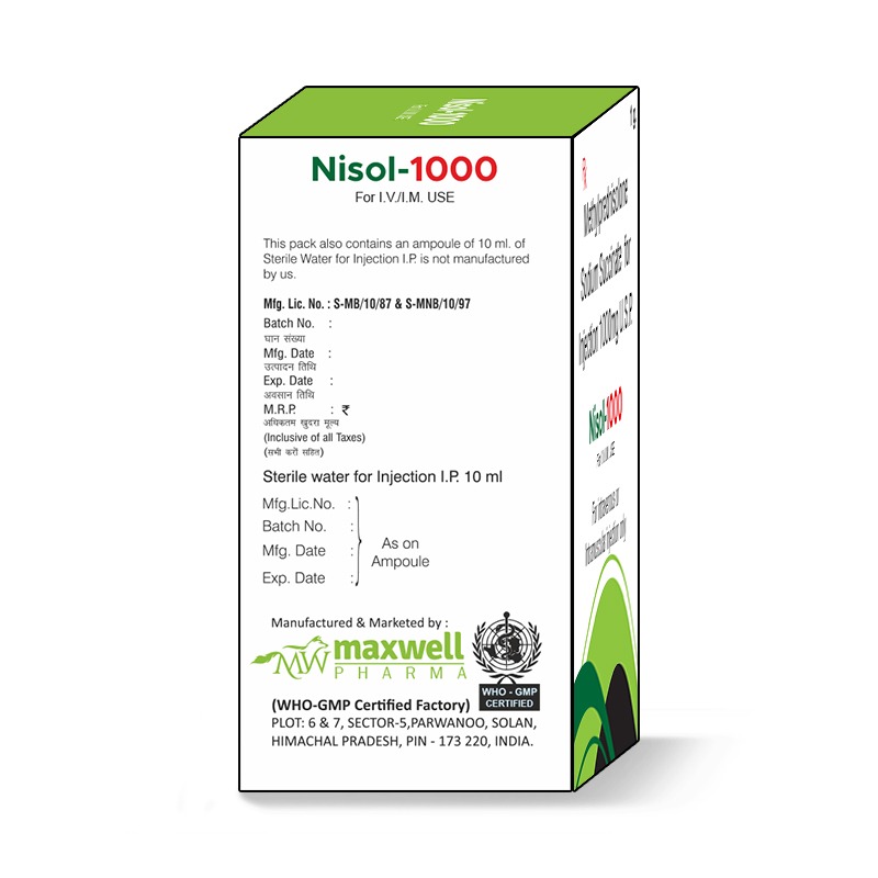 NiSol 1g is an injectable formulation containing Methylprednisolone, a potent corticosteroid used to treat a wide range of inflammatory and immune-mediated conditions. It acts by suppressing inflammation and modulating the immune response, providing relief from severe symptoms associated with various medical conditions.