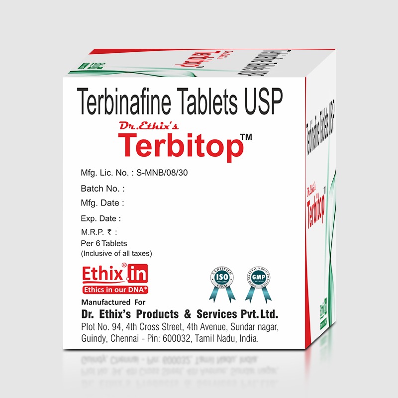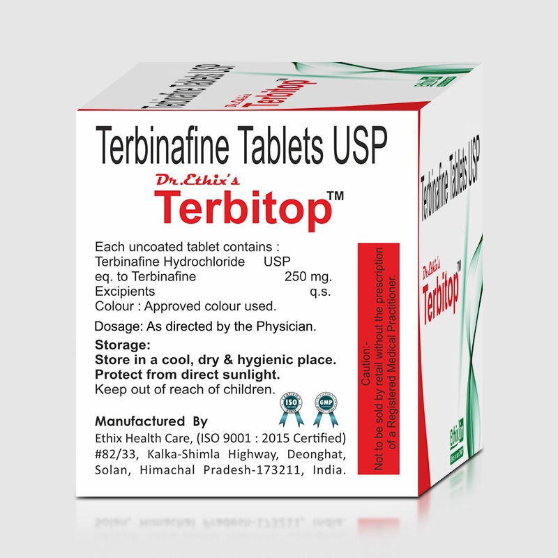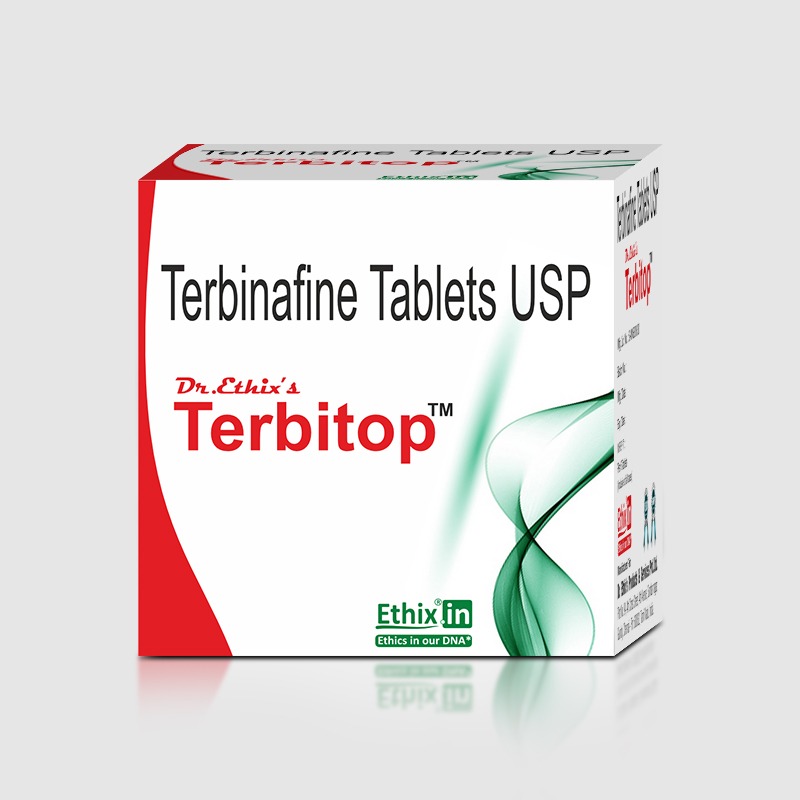 TerbiTop contains Terbinafine 250 mg, an antifungal medication belonging to the allylamine class. It is used to treat various fungal infections of the skin, hair, and nails by inhibiting the fungal enzyme squalene epoxidase, which disrupts ergosterol synthesis—an essential component of fungal cell membranes.