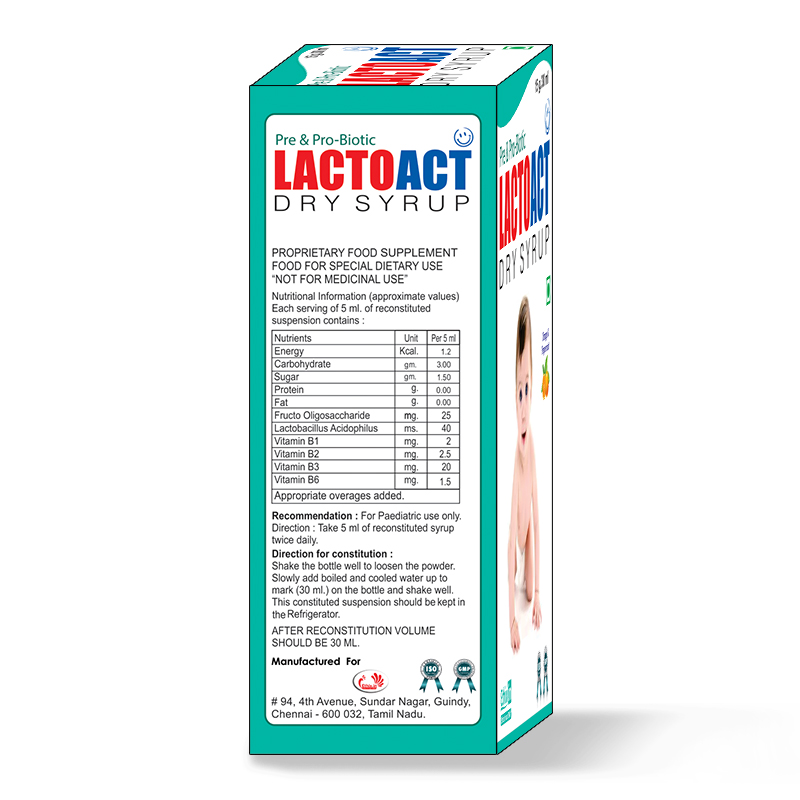 LactoAct DS is a specially formulated dry syrup that combines prebiotics, probiotics, and B-complex vitamins to support digestive health, enhance immune function, and improve overall well-being. It is particularly beneficial for individuals with digestive issues, those recovering from antibiotic therapy, and anyone looking to maintain a healthy gut microbiome.