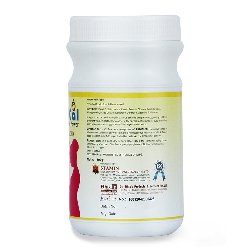 - Mix one scoop of PregniCal Protein Powder in 200 ml of warm milk or water.