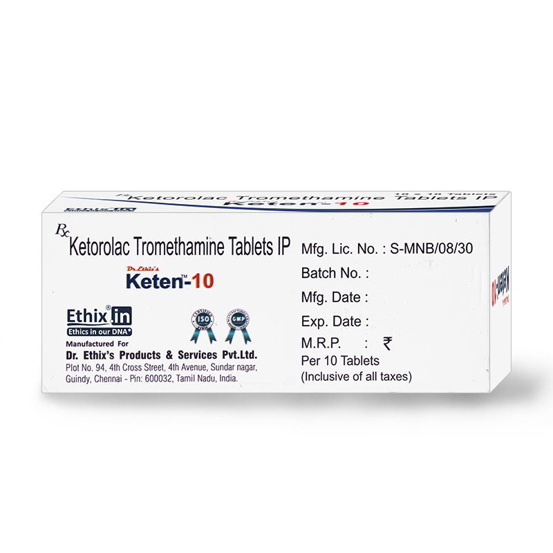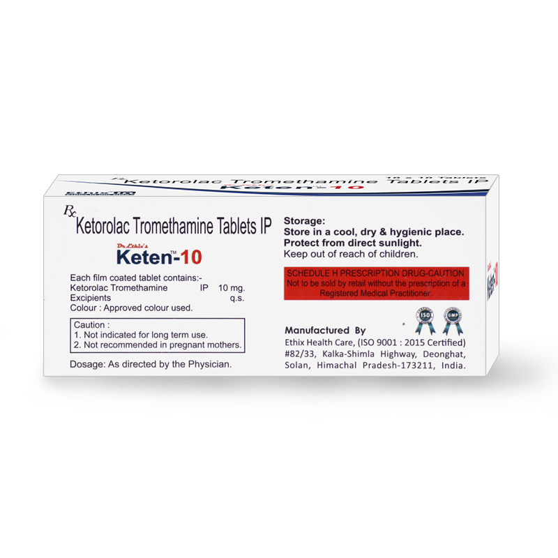 KeTen 10 is a potent and effective nonsteroidal anti-inflammatory drug (NSAID) designed to provide rapid pain relief in various acute and chronic conditions. It contains Ketorolac Tromethamine 10 mg, a powerful analgesic and anti-inflammatory agent, widely trusted for its efficacy in managing moderate to severe pain.