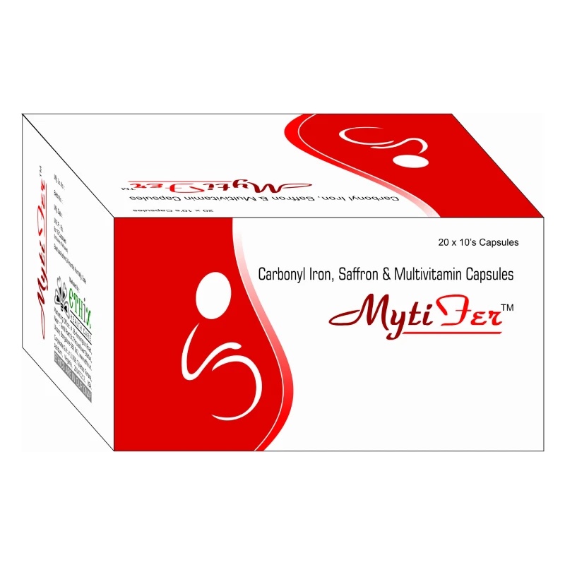 MytiFer [Cap] is a comprehensive iron supplement designed to combat iron deficiency and support overall health. The formulation combines Carbonyl Iron, a highly bioavailable and well-tolerated form of iron, with essential nutrients like Vitamin B12, Zinc, and Folic Acid. This combination promotes effective iron absorption, red blood cell production, and overall immunity.