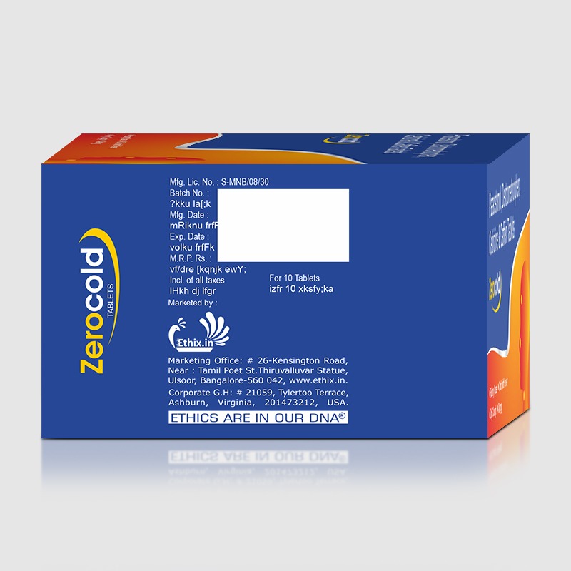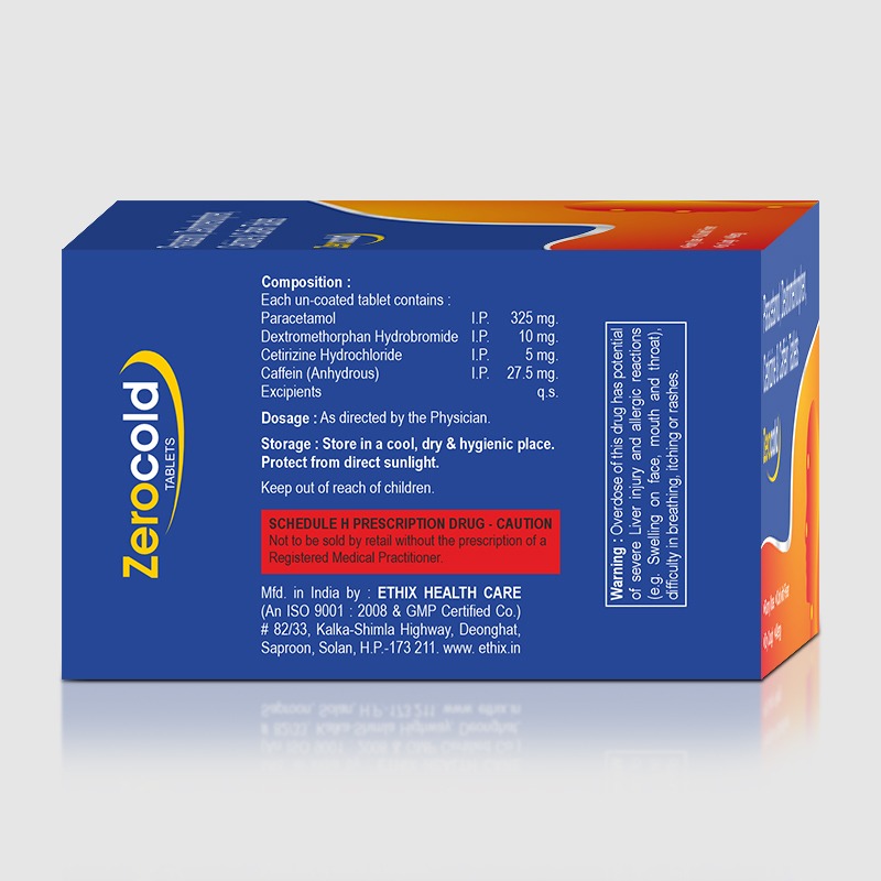 ZeroCold [Tab] is a comprehensive medication designed for the symptomatic relief of common cold, cough, and associated discomforts. This multi-ingredient formulation effectively addresses pain, fever, nasal congestion, sneezing, runny nose, and persistent cough, providing holistic care.